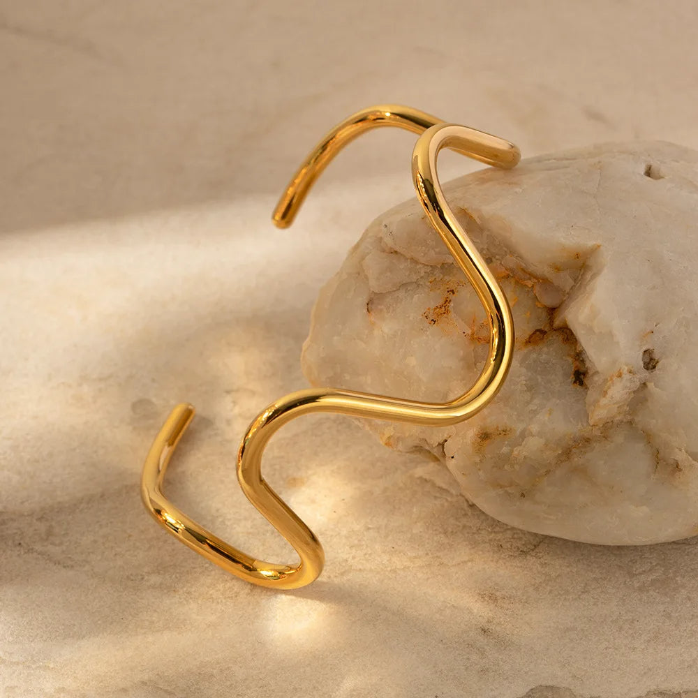 Discover the Wave Cuff Bangle, crafted from luxurious 18K Gold Plated stainless steel, available in two designs: one with a thin wave pattern and one with a medium wave pattern. Designed to withstand the elements, it's both waterproof and tarnish-free. Nickel-Free and Lead-Free, this bangle ensures your skin is comfortable all day. Its unique wavy design adds a touch of elegance, perfect for special occasions when you want to make a statement.