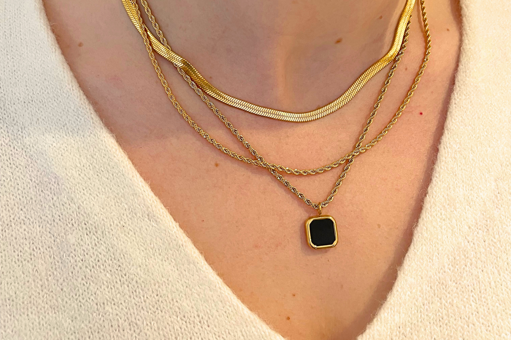 Discover the black square pendant — a classy accessory designed to suit everyday wear. Waterproof and 18k gold plated. Perfect to stack or wear on its own.