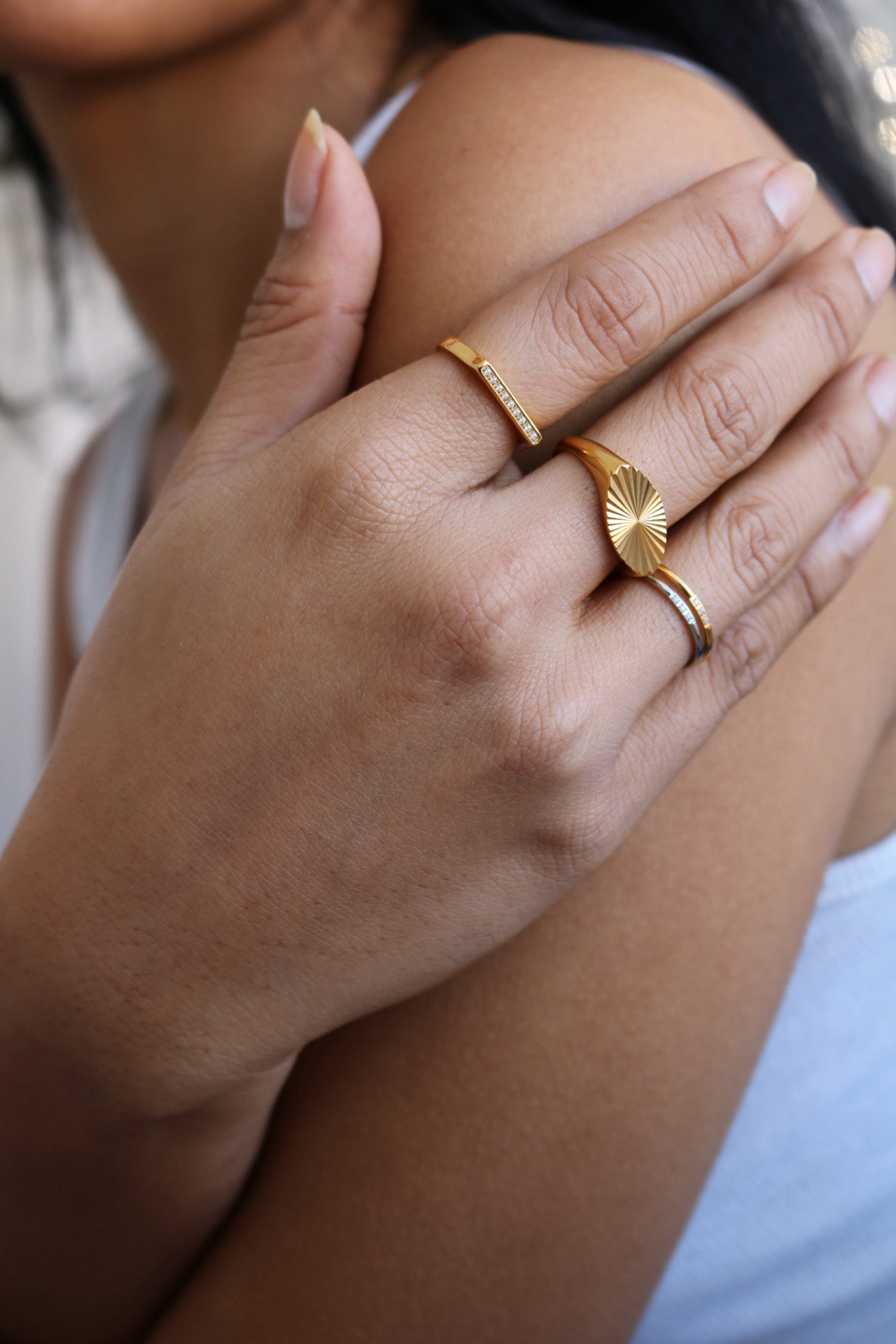 Our Eternity Ring with Cubic Zirconia is a symbol of everlasting love and commitment. Featuring a band of shimmering cubic zirconia stones, this ring exudes elegance and brilliance from every angle. Its timeless design makes it the perfect choice as a statement piece. The CZ stones offer a brilliant sparkle, while the sleek, polished band ensures it complements any style. This ring is an unforgettable addition to any jewellery collection. Stainless Steel, 18k Gold Plating.
