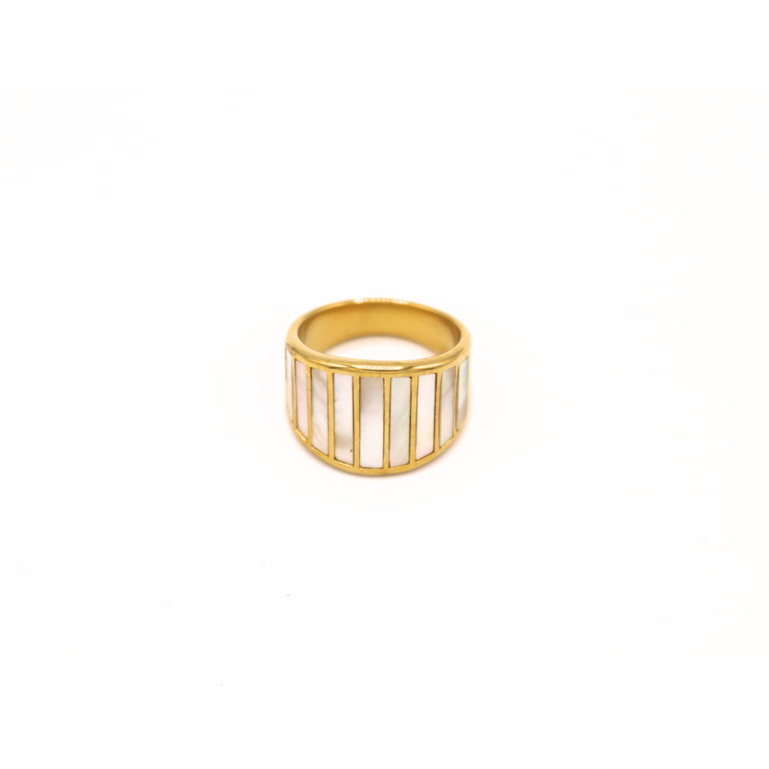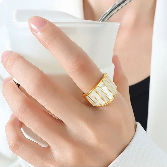 Discover the White Shell Ring, a featuring white shell inlays. Each piece is meticulously crafted, featuring an 18K gold-plated finish that radiates sophistication. The waterproof and tarnish-free properties ensure longevity, making it an ideal accessory for everyday wear or special occasions. Additionally, the Bamboo Ring is nickel-free and lead-free, ensuring a comfortable and worry-free wearing experience.