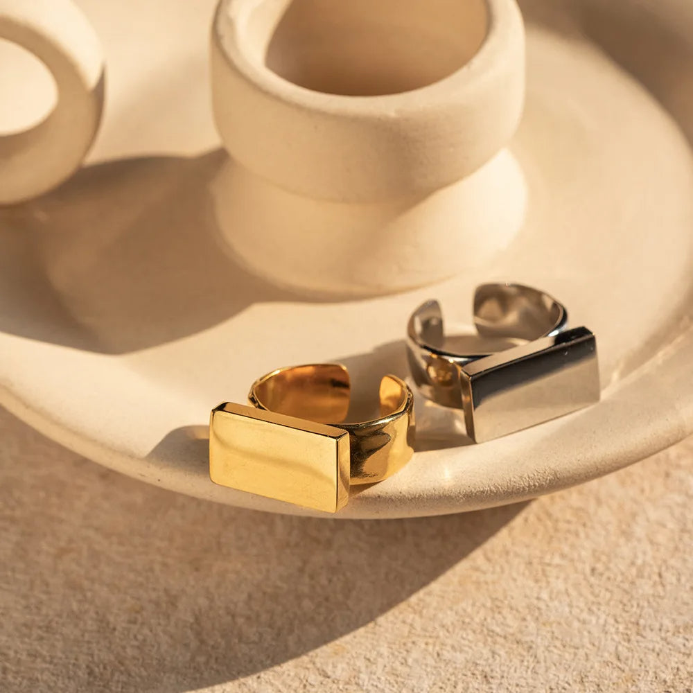 Introducing the Block Ring, featuring a chunky block shape with an open design. Each piece is meticulously crafted with an 18K gold-plated finish, ensuring durability and sophistication. Its waterproof and tarnish-free properties make it suitable for everyday wear or special occasions. Plus, it's nickel-free and lead-free for a comfortable experience. Available in Gold and Silver finishes, this versatile ring effortlessly complements any outfit. The open design allows for easy adjustment to fit your finger perfectly.